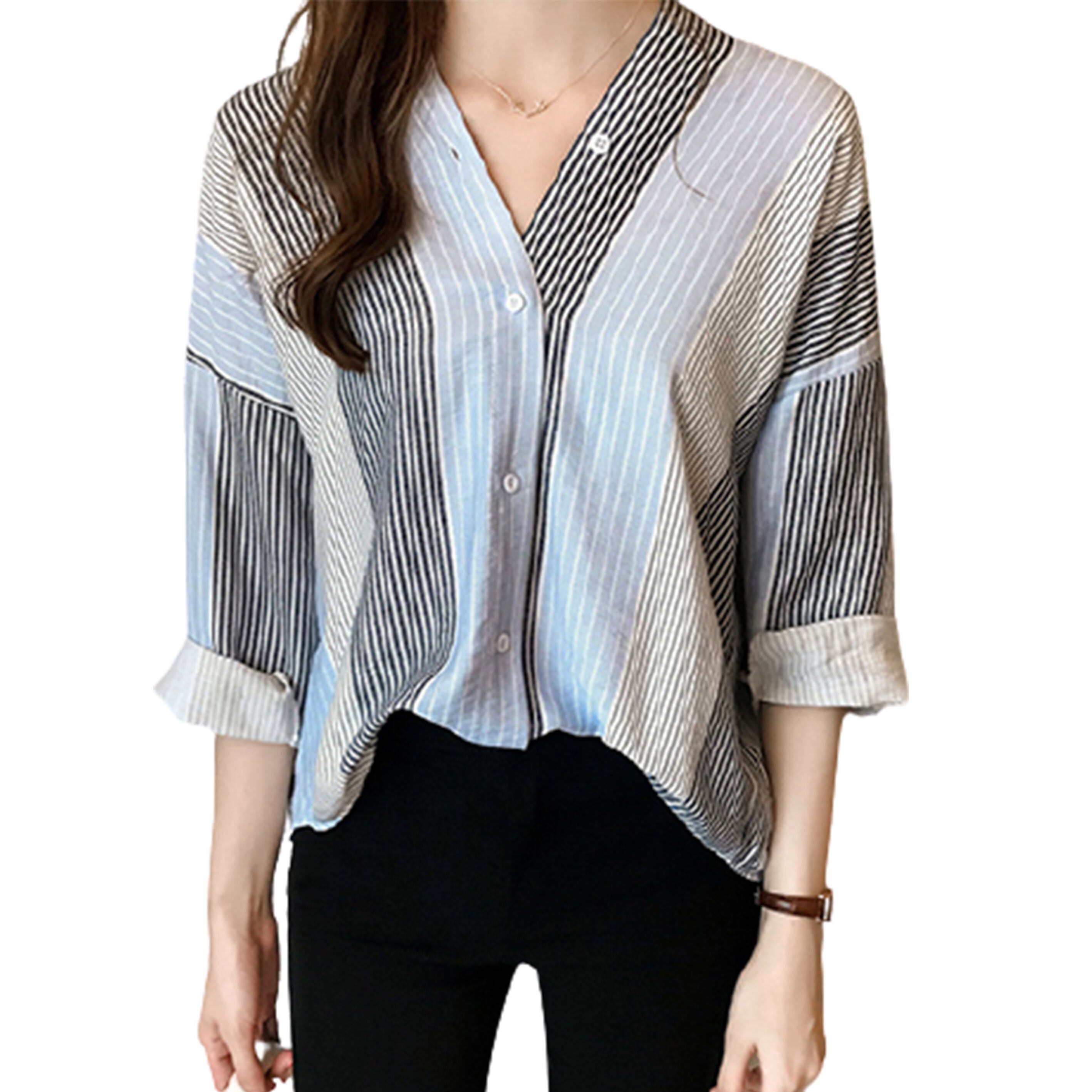 ★送料無料★ Vネックルーズストライプシャツ レディース ブラウス lit-188 【韓国ファッション】