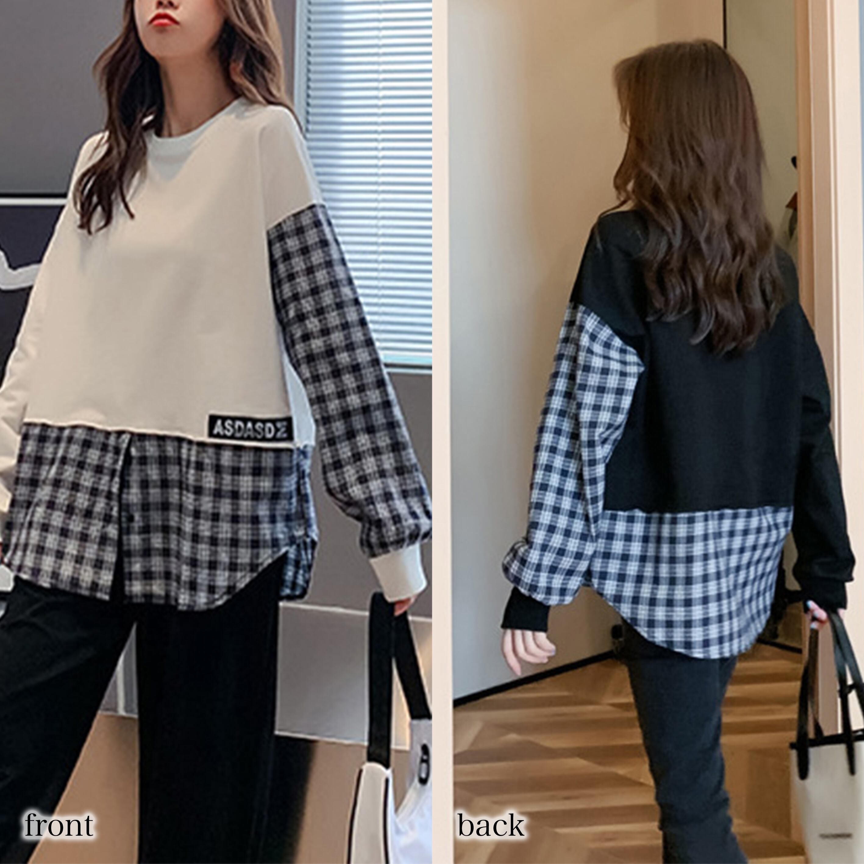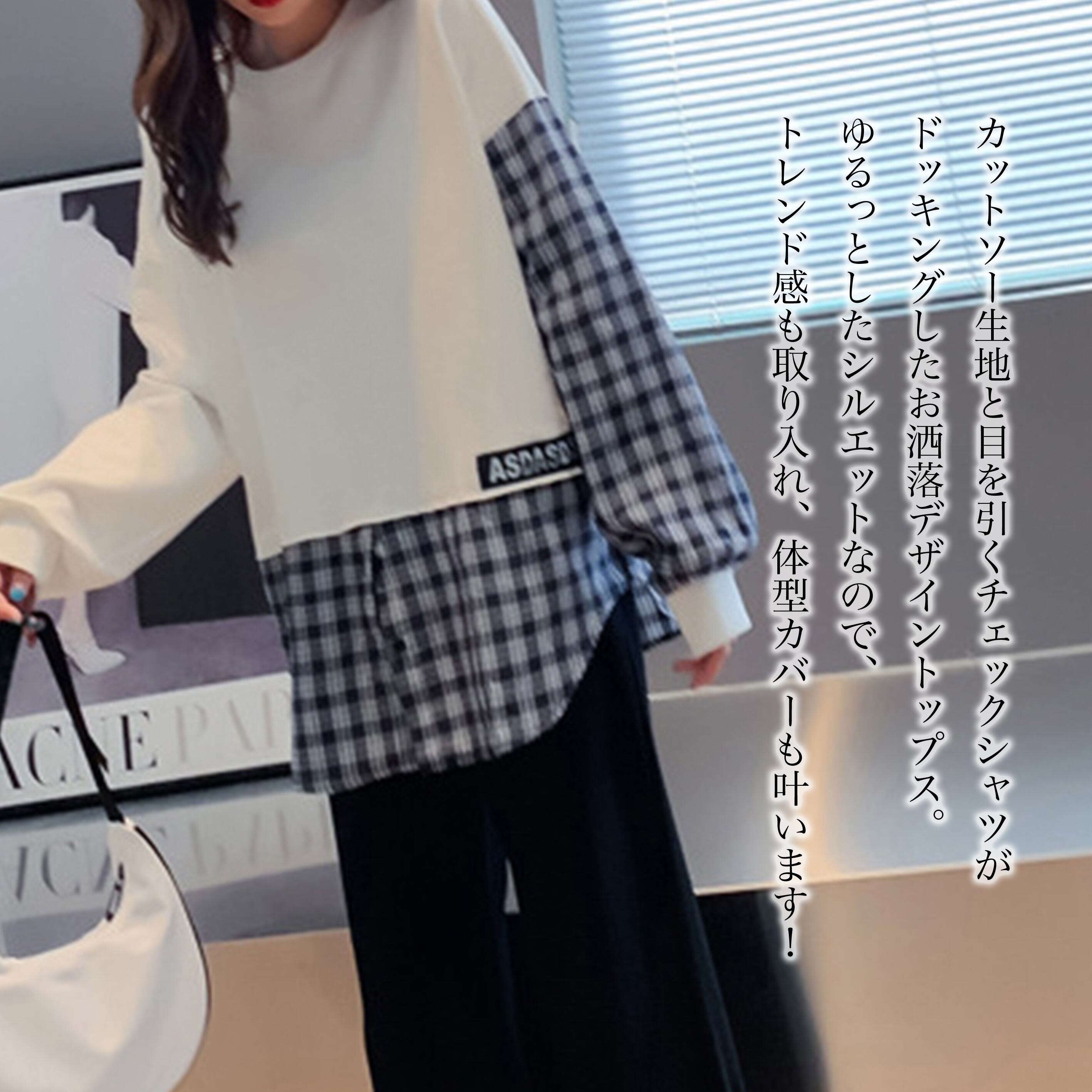★送料無料★ ドッキングチェック柄トップス レディース ロングTシャツ lit-225 【韓国ファッション】